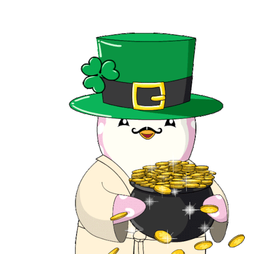 A lucky Pudgy Penguin character, wearing a green leprechaun hat with a clover, holds a sparkling pot of gold coins.