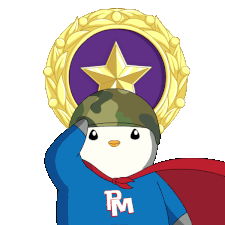 A cartoon Pudgy Penguin in a military helmet and cape salutes, honoring Gold Star families and veterans.