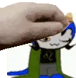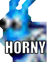 A blue horned bunny with 'horny' text, associated with Golden Sun and Spiral Shell, for a playful sticker.
