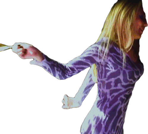 Blonde woman in a dynamic pose, jumping or playing with energy, captured in an animated sticker.