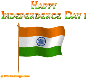 Animated sticker celebrating India's Independence Day, featuring a waving Indian flag and 'Happy Independence Day!' text.