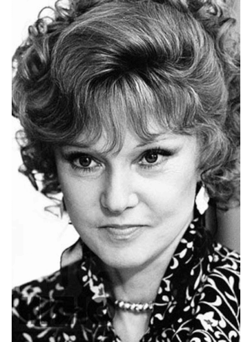 a black and white photo of a woman with curly hair wearing a pearl necklace .