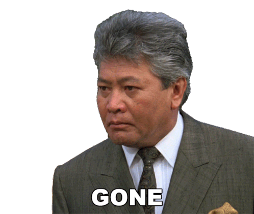 Man (Sato) from The Karate Kid Part II reacts with a surprised expression as the word "GONE" appears.