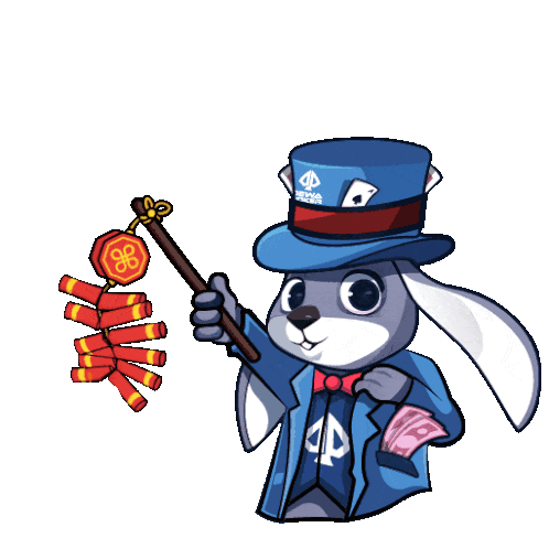 A cute cartoon rabbit in a top hat celebrates Chinese New Year (Imlek) with firecrackers, wishing 'Selamat Tahun Baru Imlek'.