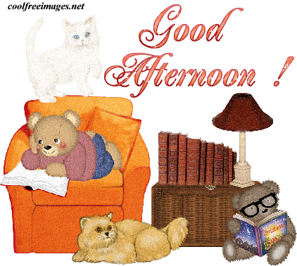 A cozy 'Good Afternoon' scene featuring a white cat, a ginger cat, two teddy bears reading books, and a warm lamp.