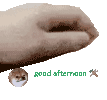 An animated sticker featuring a cute hamster sitting beside a hand displaying 'Good Afternoon', referencing Vita3k Moderator.