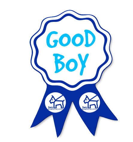An animated blue and white rosette ribbon with "GOOD BOY" text, featuring a dog walking and pet sitting logo.