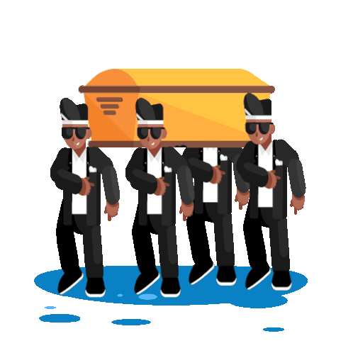 An animated sticker of the Coffin Dance meme, featuring four stylized pallbearers carrying a yellow coffin and dancing.