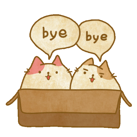 Two adorable cartoon cats peeking out of a cardboard box, waving goodbye with speech bubbles saying "bye bye".