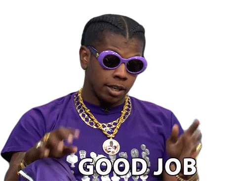 Trinidad James, wearing purple sunglasses and gold chains, gestures with his hands while the text 'GOOD JOB' appears.