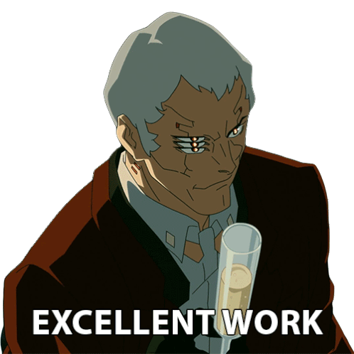 Faraday from Cyberpunk Edgerunners raises a glass and says 'Excellent Work' in this animated sticker.