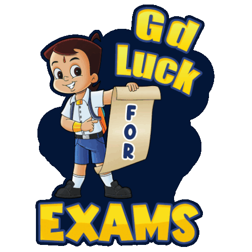 Chhota Bheem wishes "Good Luck For Exams" while holding a scroll, perfect for students.