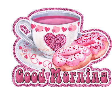 A cheerful pink coffee cup with 'Good Morning' text, topped with a donut and surrounded by sparkling glitter.