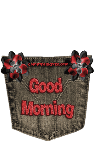 A charming animated sticker featuring a cute cartoon pig peeking out from a denim pocket, wishing a 'Good Morning'.