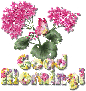 Vibrant pink flowers, a delicate butterfly, and sparkling 'Good Morning!' text to brighten your day.