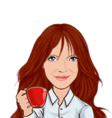 A cheerful animated woman with red hair waves and holds a coffee cup, wishing 'Good Morning'.