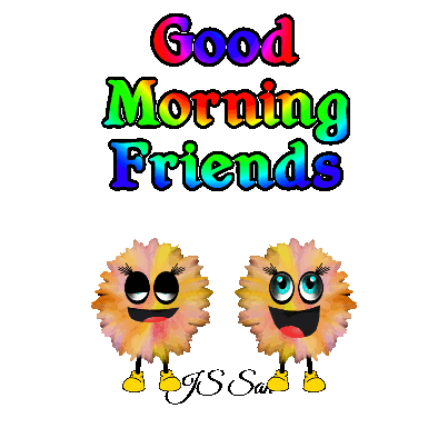 A cheerful animated sticker wishing 'Good Morning Friends' with two adorable, fluffy, smiling characters and vibrant text.