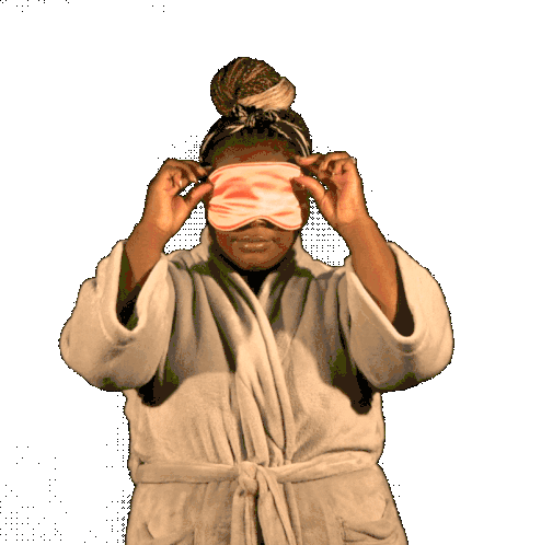 A person in a robe removes a sleep mask, smiles, and enthusiastically greets the new day with 'Good Morning!'