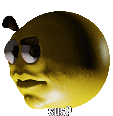 A yellow, 3D-rendered emoji with a suspicious expression and raised eyebrows, asking "sus?". Perfect for questioning or meme reactions.