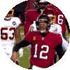 Football player Tom Bredy in a red number 12 jersey on the field, greeting with a good morning.