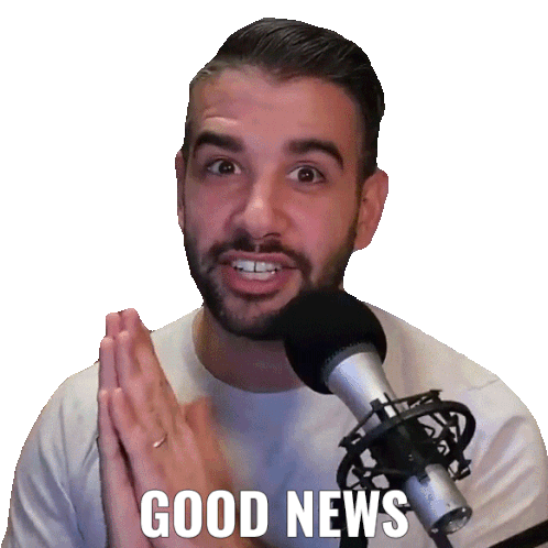 Justin Khanna, a man with a beard, enthusiastically announces 'GOOD NEWS' into a microphone.