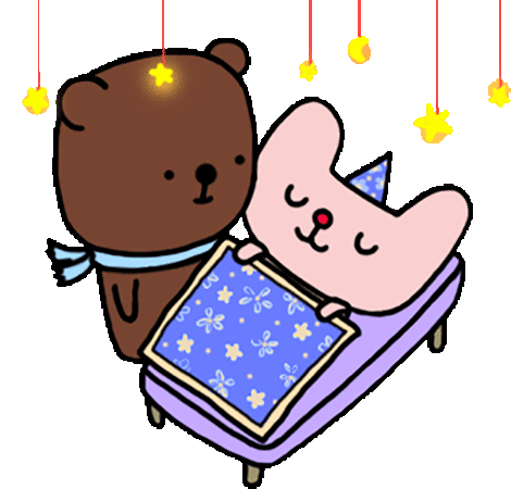A sweet brown bear gives a gentle goodnight kiss to a sleeping pink bunny in bed, surrounded by twinkling stars.