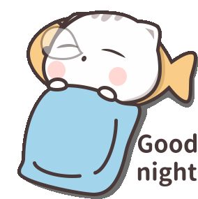 A cute cartoon cat-like creature sleeps peacefully under a blue blanket with a fish pillow, wishing 'Good night'.