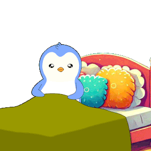 A cute Pengu Pudgy penguin waves good night from bed, then snuggles down to sleep for sweet dreams.