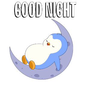 A cute cartoon penguin sleeps peacefully on a crescent moon, with 'GOOD NIGHT' text above, perfect for bedtime wishes.