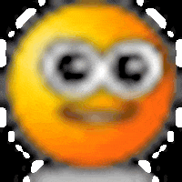 A blurry, pixelated yellow-orange smiley face with wide eyes and a big smile, framed by a dashed white border.