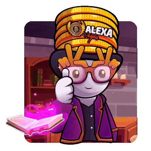 Alexa Vegas mascot, a cartoon character in a top hat and glasses, gives a thumbs up and peace sign, showing approval.