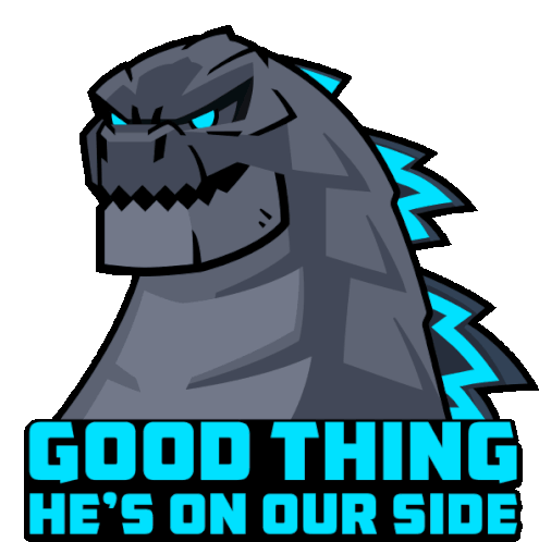 Animated cartoon Godzilla with glowing blue features, subtly moving, with the text 'GOOD THING HE'S ON OUR SIDE' below, signifying strong team support.