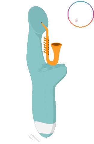 A blue vibrator plays a saxophone, surrounded by a colorful circle, embodying good vibes and positive energy.