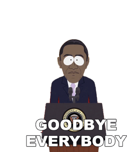 South Park's Barack Obama character at a podium saying 'Goodbye Everybody' with a funny expression.
