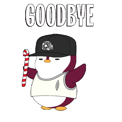 A cute Pudgy Penguin, wearing a hat and holding a candy cane, waves goodbye with the word 'GOODBYE' above.