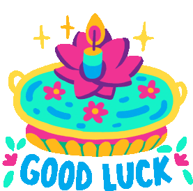 Vibrant 'Good Luck' sticker featuring a lit candle, pink lotus flower, and decorative bowl, surrounded by stars.