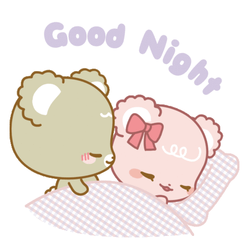 Adorable light brown bear gently approaches a sleeping pink bear under a blanket, conveying a sweet goodnight moment.