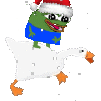 Pepe the frog, wearing a festive Santa hat, joyfully rides a white goose across the screen in this animated sticker.