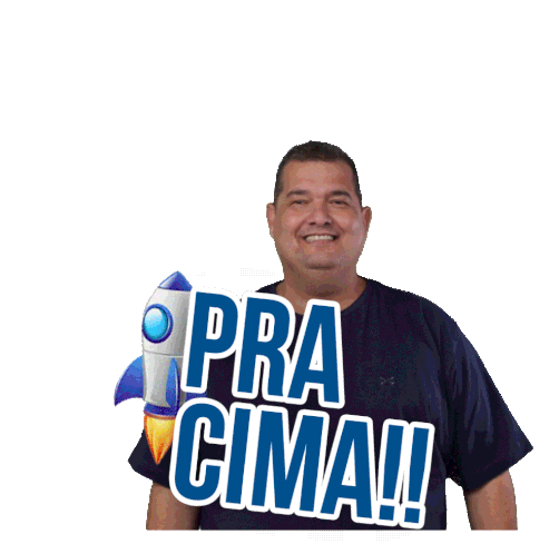 George Reis, also known as Gordinho Da Favela, enthusiastically points and gives a thumbs up with a 'Pra Cima!' rocket graphic.