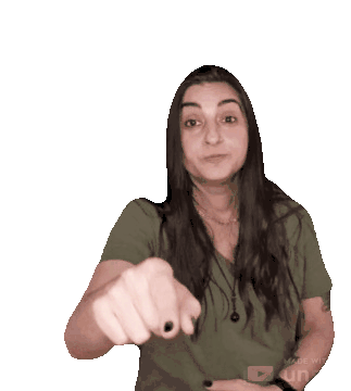 A woman from Gordyfit uses sign language to point at the viewer, making the 'you' gesture with a pursed mouth expression.
