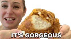 Woman excitedly holding and showing off a piece of gorgeous, delicious fried chicken, exclaiming "IT'S GORGEOUS".