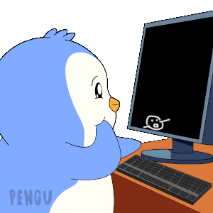 Gork Pengu, a cute cartoon penguin, intently watches a computer screen as a simple face drawing appears and disappears.