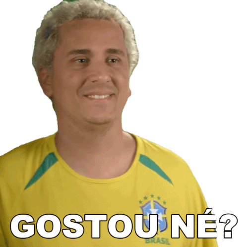 Rafael Portugal smiles and gestures, asking 'Gostou Né?' while wearing a Brazil jersey, expressing approval or satisfaction.