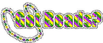 A sparkling pile of purple, green, and gold Mardi Gras beads with the playful question "Got Beads?".