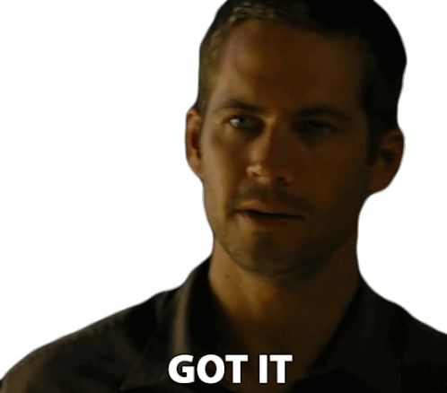 Paul Walker as Brian O'Conner from Fast & Furious, nodding subtly and saying 'Got It' with a slight smirk.
