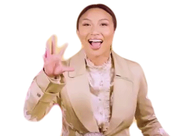 Jeannie Mai, with a wide smile and open mouth, points forward with enthusiasm, conveying excitement and a sense of 'got it'.