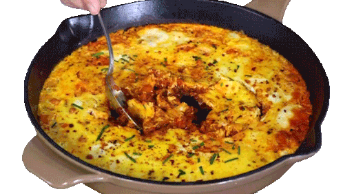 Grabbing a scoop of delicious Chili Pepper Madness menemen, a Turkish scrambled egg dish, from a skillet.