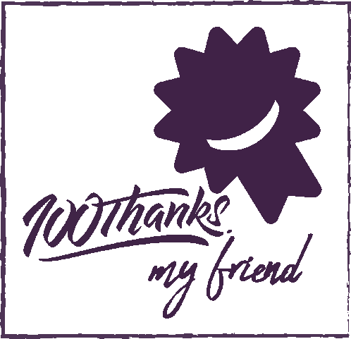 A thank you sticker featuring '100 thanks my friend' in English, along with 'Gracias Amigo' and other multilingual thanks.