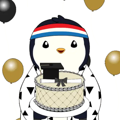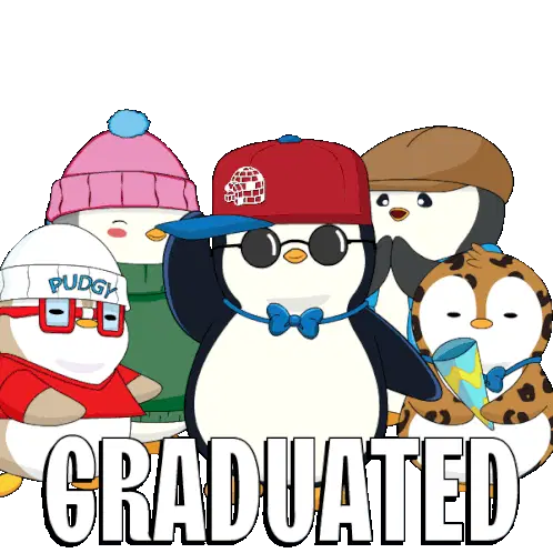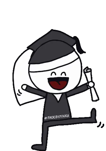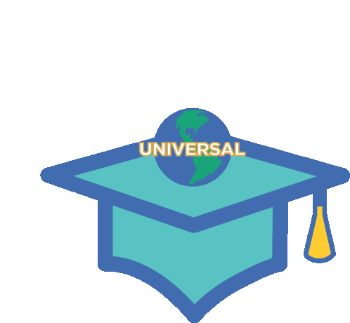 A vibrant animated sticker celebrating graduation with a cap, globe, and the text "WE DID IT!", referencing Universal Studios.