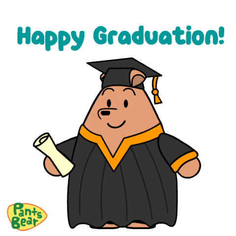 Pants Bear celebrates graduation in a cap and gown, holding a diploma scroll, with 'Happy Graduation!' text.
